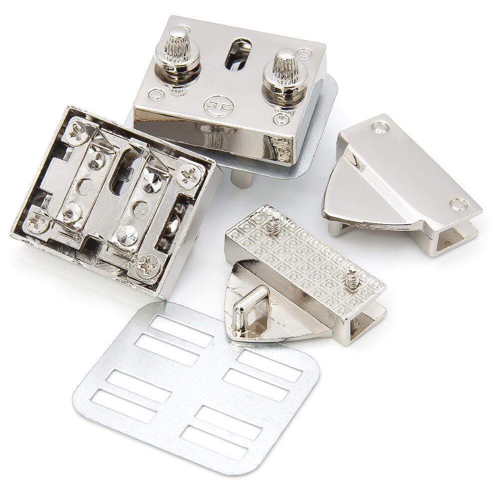 Нижняя часть (размер 25х30х8мм) имеет две кнопки, отверстие с защелкой, и крепится к основанию сумки с помощью четырех крепежных усиков (13мм).