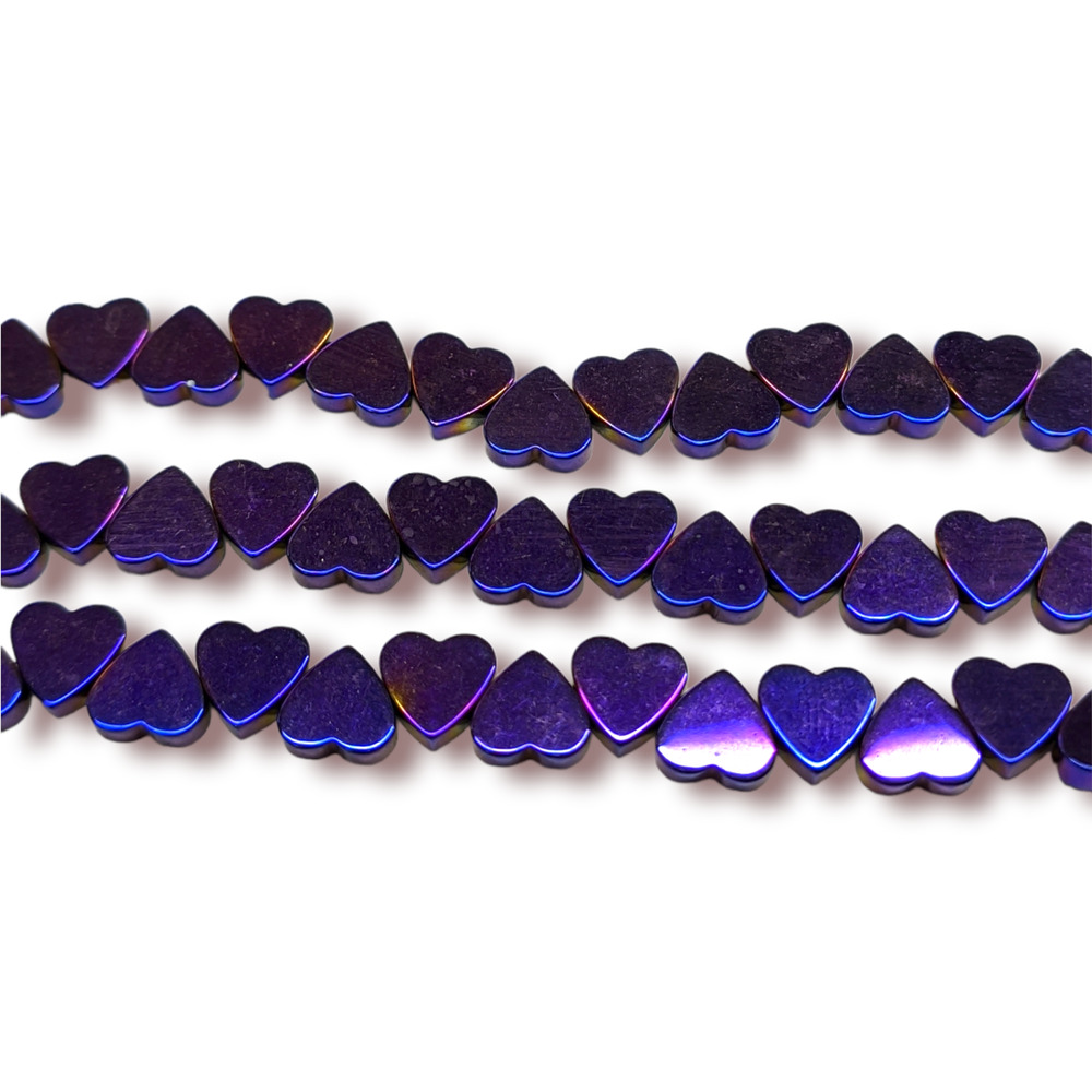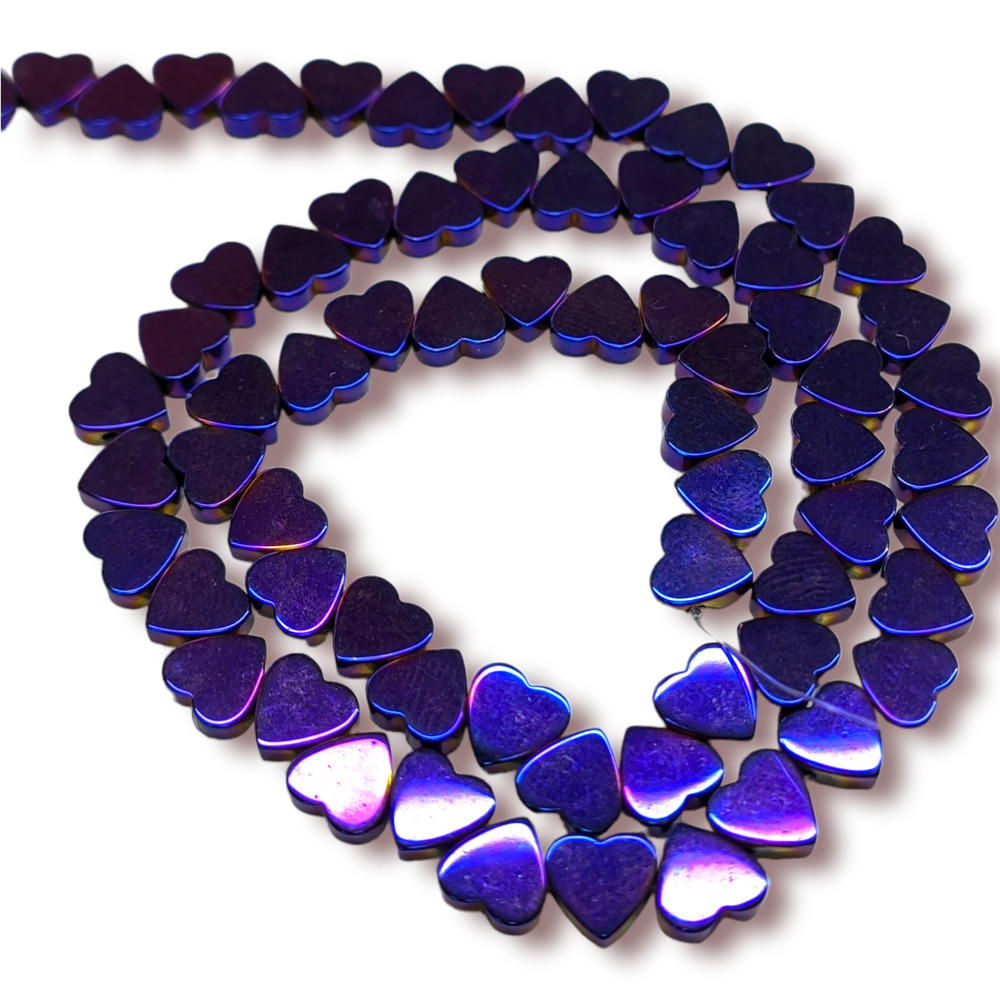 Бусины изготовлены из натурального камня гематита в форме плоского сердца. Особое покрытие придает бусинам сияние и металлизированный эффект.