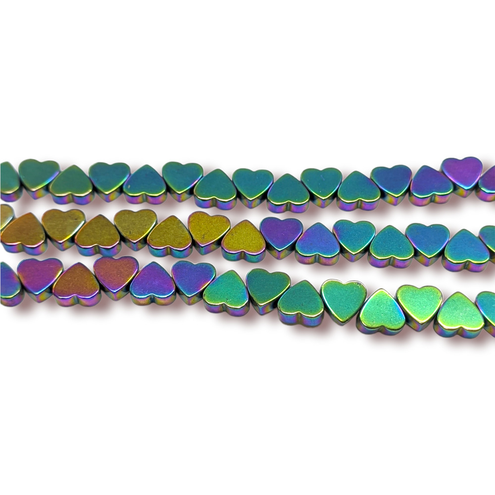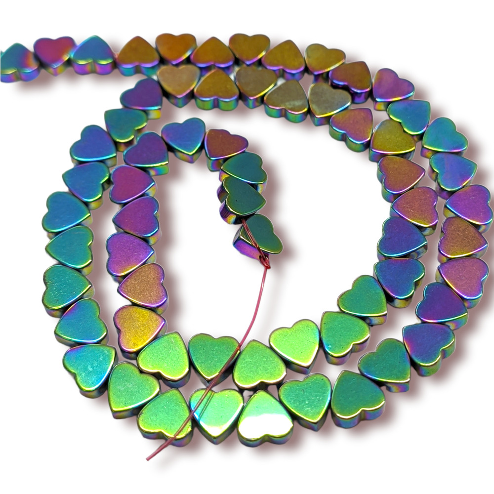 Бусины изготовлены из натурального камня гематита в форме плоского сердца. Особое покрытие придает бусинам сияние и металлизированный эффект.