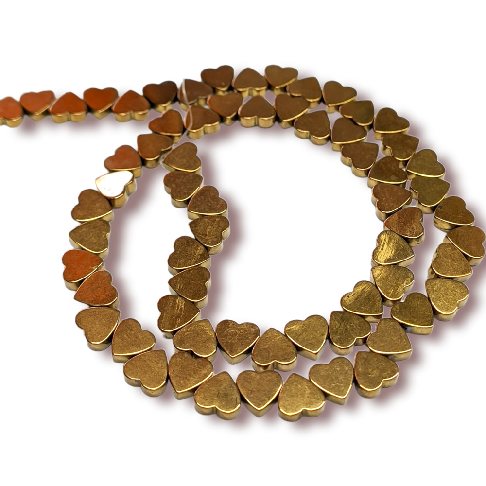 Бусины изготовлены из натурального камня гематита в форме плоского сердца. Особое покрытие придает бусинам сияние и металлизированный эффект.