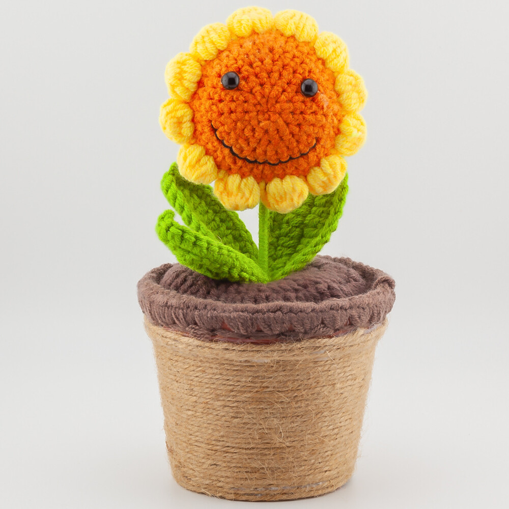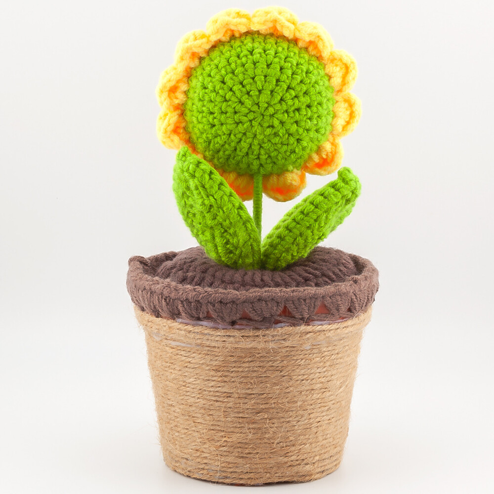 Подсолнух в горшке, вязаный, представляет собой оригинальное и стильное декоративное украшение, которое добавит уюта и атмосферу природы в ваш дом или офис. Этот товар создан с любовью к деталям, что делает его привлекательным элементом интерьера.